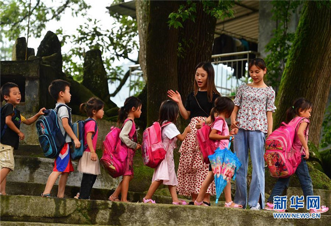 在烏英苗寨教學(xué)點,桿洞鄉(xiāng)中心校老師韋春蘭(后排左)和孩子們告別(7月1日攝)。桿洞鄉(xiāng)中心校近期開展送教到烏英活動,定期到教學(xué)點開展送教工作。 新華社記者 黃孝邦 攝