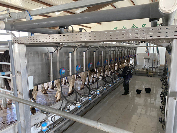 奶牛每天需要擠奶2到3次。牧場(chǎng)的每個(gè)牛舍里,都配有1個(gè)擠奶廳,奶牛吃完飼料,直接就可以到擠奶廳擠奶。