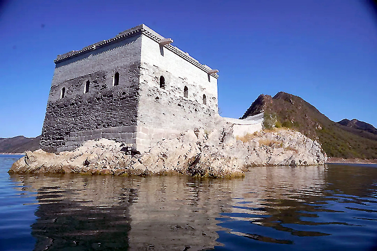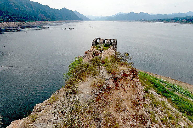 1975年至1981年,為了給天津供水,利用這里的山形地勢,在灤河上游寬城、遷西、興隆三縣交界處,修建了潘家口水庫。引灤入津工程橫切長城,喜峰口、潘家口兩座雄關(guān)鑲?cè)胍惶侗滩ǎ瑥亩纬扇f里長城一處絕景——“水下長城”。