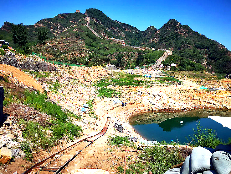 現(xiàn)場施工負責(zé)人杜勝軍說:“這段長城維修難點是運輸,今年水位下降比較厲害,增加了運輸難度。”