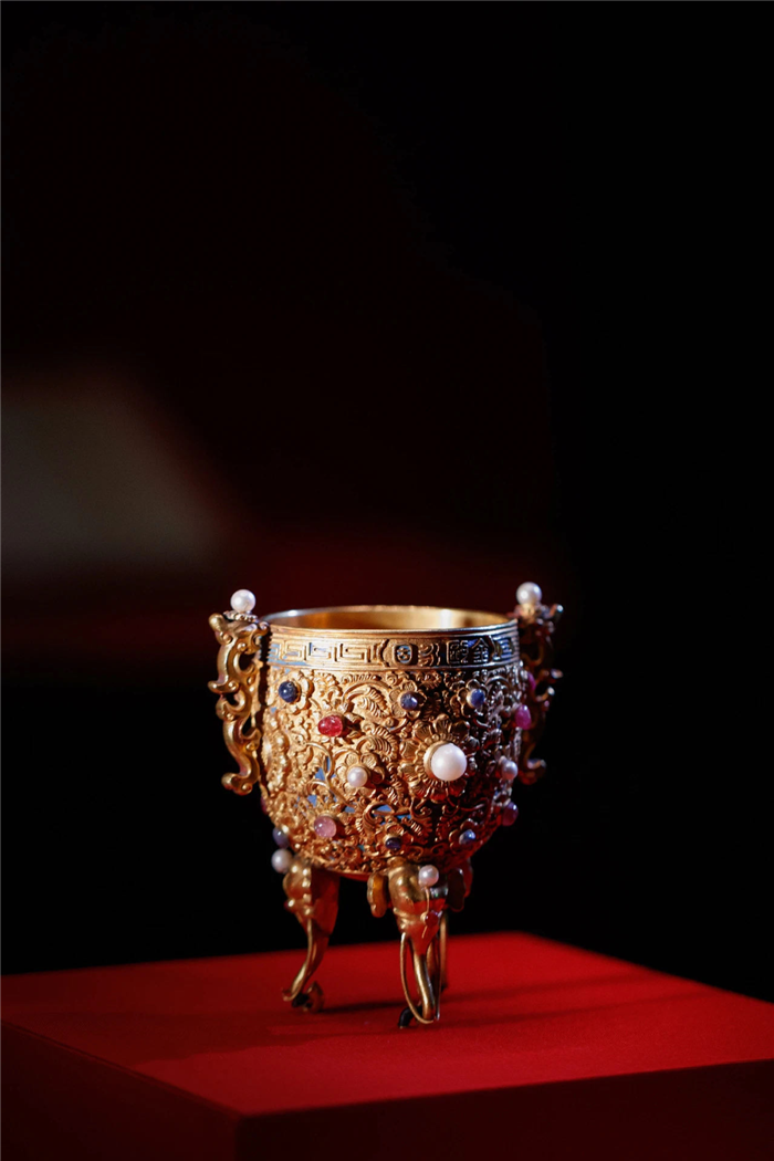 ▲圖為2020年9月10日,紫禁城建成六百年展覽中展出的金甌永固杯。圖片來源:微故宮
