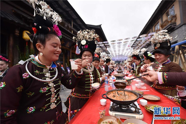 10月18日,苗族群眾在貴州省丹寨縣萬(wàn)達(dá)小鎮(zhèn)吃新節(jié)長(zhǎng)桌宴上品嘗佳肴。當(dāng)日,貴州省黔東南苗族侗族自治州丹寨縣萬(wàn)達(dá)小鎮(zhèn)舉辦苗族吃新節(jié)體驗(yàn)活動(dòng)。當(dāng)?shù)孛缱逋J笙舞、品長(zhǎng)桌宴,并邀請(qǐng)游客參與其中,大家在歡聲笑語(yǔ)中樂(lè)享金秋。新華社發(fā)(凱尚宇攝)