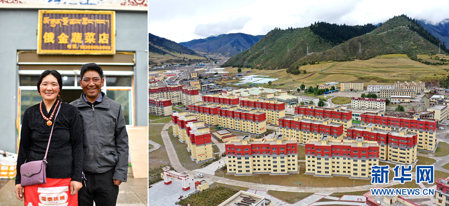 2020年9月22日拍攝的拼版照片:左圖為西藏自治區(qū)昌都市類烏齊縣長毛嶺鄉(xiāng)達雄村村民俄金(右)和妻子阿丁在安置點俄金蔬菜店前;右圖為類烏齊縣桑多扶貧開發(fā)區(qū)易地扶貧搬遷安置點一角(無人機照片)。 新華社記者 詹彥 攝