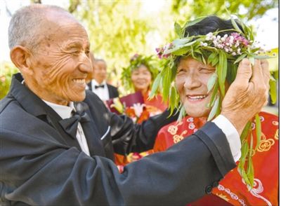 浙江省湖州市長(zhǎng)興縣夾浦鎮(zhèn)長(zhǎng)平村“歲月述金婚”活動(dòng)現(xiàn)場(chǎng),楊水良(左)為妻子楊富元佩戴愛的花環(huán)。 |