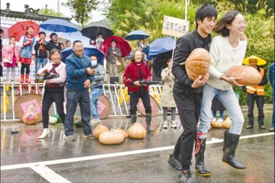 湖北省蘄春縣檀林鎮(zhèn)霧云山村村民們和游客參加運(yùn)南瓜趣味比賽,歡慶豐收。 |