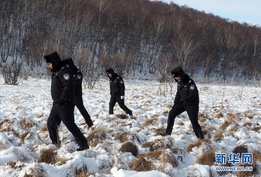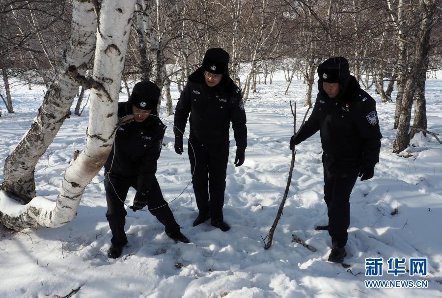 11月27日,克什克騰旗森林公安民警在黃崗梁國(guó)家森林公園內(nèi),解除盜獵分子下的鋼絲套,消除野生動(dòng)物安全隱患。新華社發(fā)(王志國(guó) 攝)