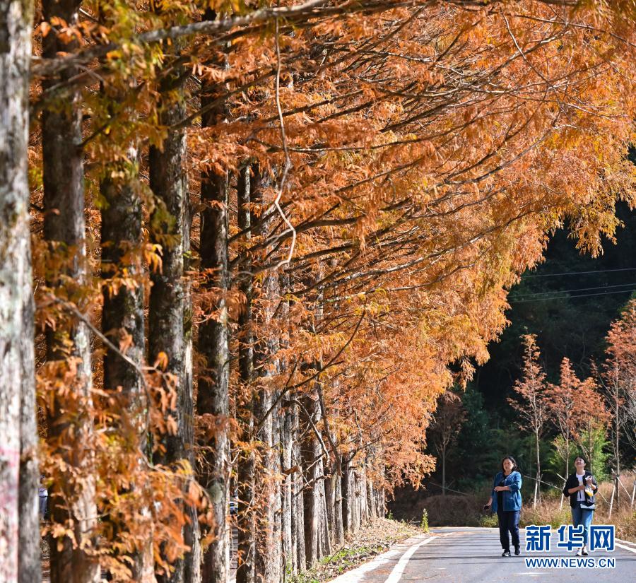 游客在福建省三明市將樂縣龍棲山國家級自然保護(hù)區(qū)水杉大道游覽(11月20日攝)。新華社記者 宋為偉 攝