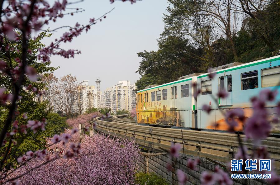 2月23日,在重慶軌道交通2號線佛圖關(guān)段,一列單軌列車穿越花海奔馳而過。新華社記者 劉潺 攝