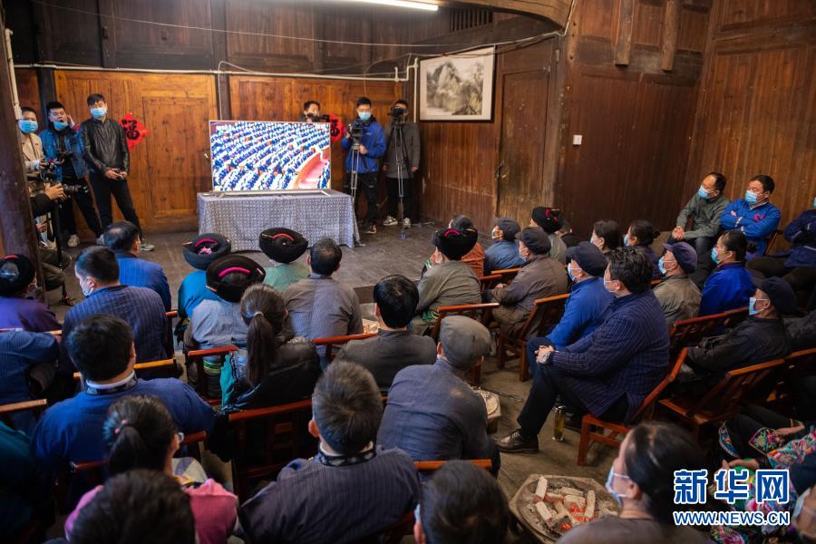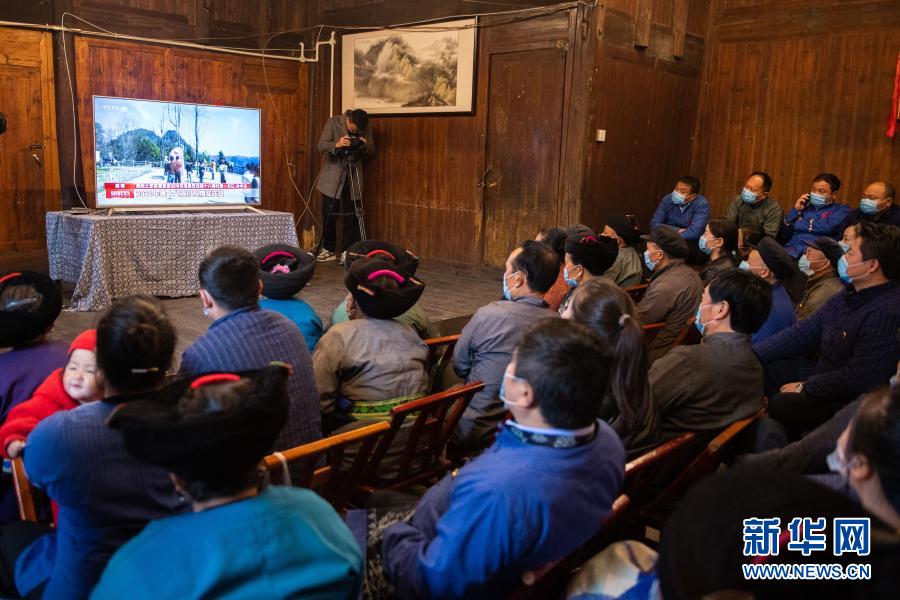 2月25日上午,在湖南省湘西土家族苗族自治州花垣縣十八洞村,當(dāng)?shù)馗刹俊⑷罕娫谝粦?hù)村民家收看全國(guó)脫貧攻堅(jiān)總結(jié)表彰大會(huì)直播,電視畫(huà)面中正在介紹十八洞村。新華社記者 陳思汗 攝