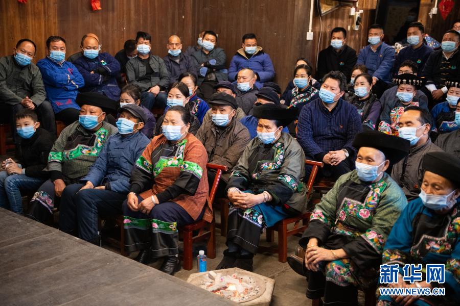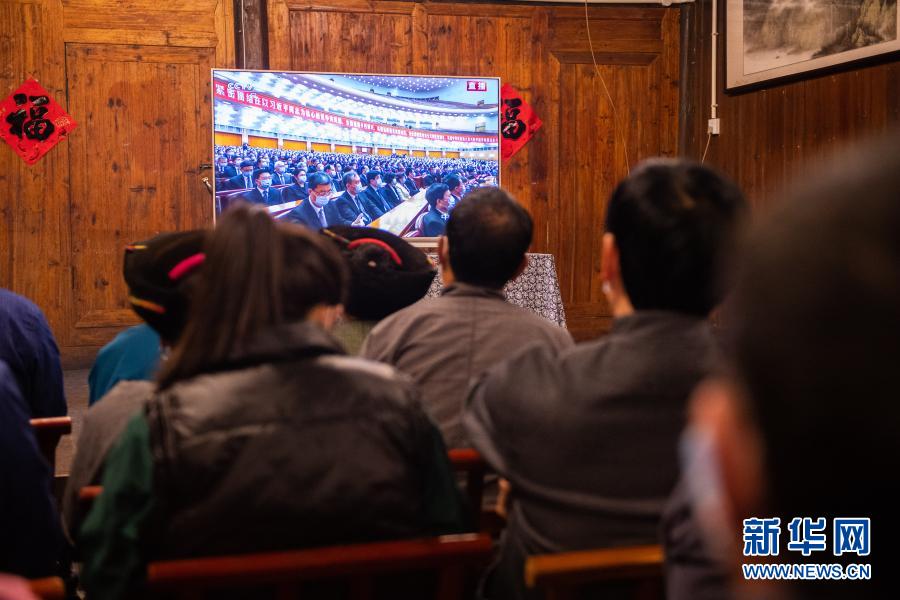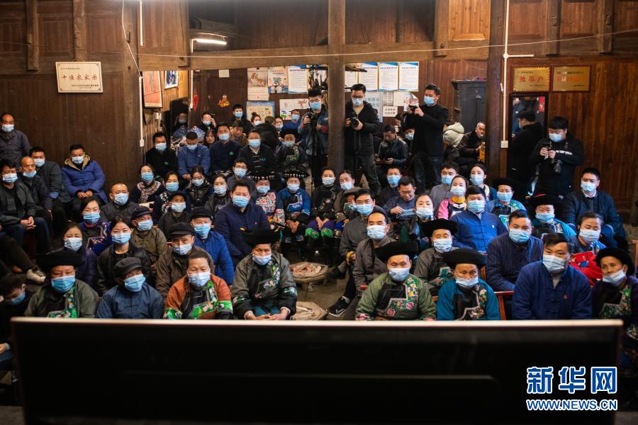 2月25日上午,在湖南省湘西土家族苗族自治州花垣縣十八洞村,當(dāng)?shù)馗刹俊⑷罕娫谝粦?hù)村民家收看全國(guó)脫貧攻堅(jiān)總結(jié)表彰大會(huì)直播。新華社記者 陳思汗 攝