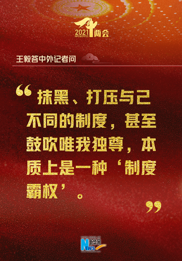 原聲回放:制度的選擇需要量體裁衣,不能削足適履。一個國家的路走得對不對,關(guān)鍵在于是否符合本國國情。抹黑、打壓與己不同的制度,甚至鼓吹唯我獨尊,本質(zhì)上是一種“制度霸權(quán)”。