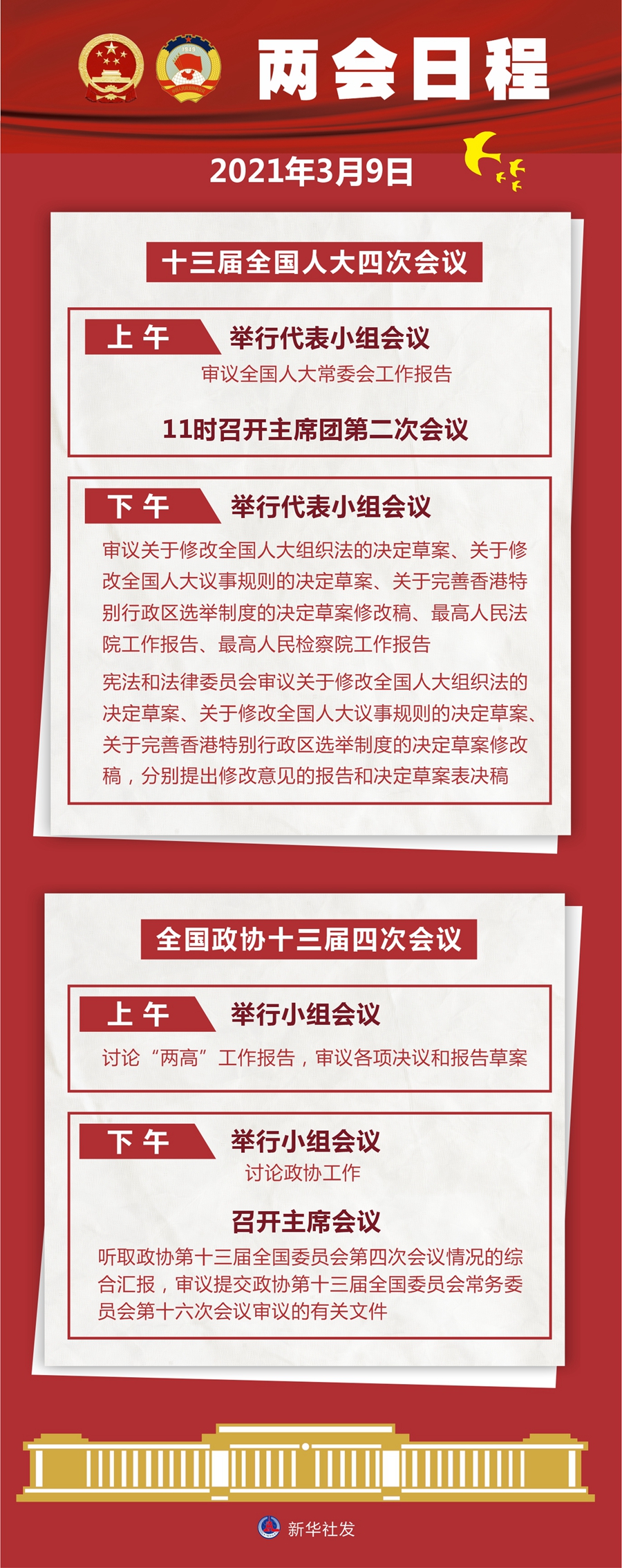 十三屆全國(guó)人大四次會(huì)議9日上午舉行代表小組會(huì)議,審議全國(guó)人大常委會(huì)工作報(bào)告;11時(shí)召開(kāi)主席團(tuán)第二次會(huì)議。下午舉行代表小組會(huì)議,審議關(guān)于修改全國(guó)人大組織法的決定草案、關(guān)于修改全國(guó)人大議事規(guī)則的決定草案、關(guān)于完善香港特別行政區(qū)選舉制度的決定草案修改稿、最高人民法院工作報(bào)告、最高人民檢察院工作報(bào)告;憲法和法律委員會(huì)審議關(guān)于修改全國(guó)人大組織法的決定草案、關(guān)于修改全國(guó)人大議事規(guī)則的決定草案、關(guān)于完善香港特別行政區(qū)選舉制度的決定草案修改稿,分別提出修改意見(jiàn)的報(bào)告和決定草案表決稿。