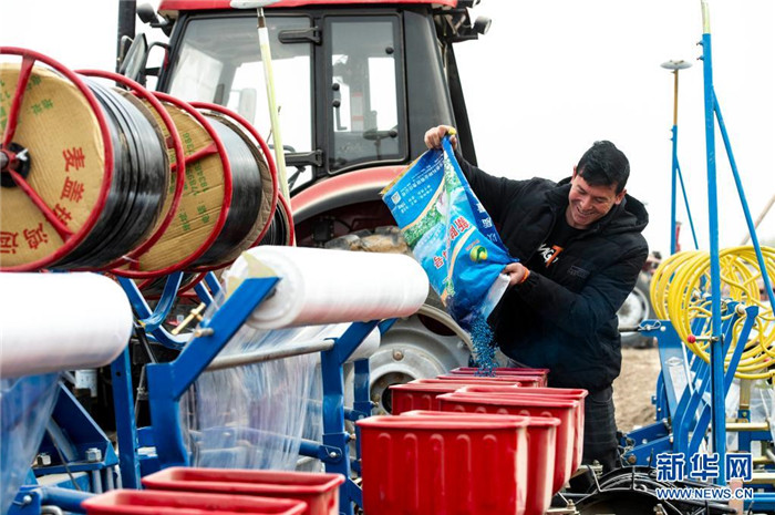在新疆喀什地區(qū)莎車縣,阿卜杜薩力·阿伍提往播種機(jī)里倒棉籽(3月26日攝)。新華社記者 馬鍇 攝