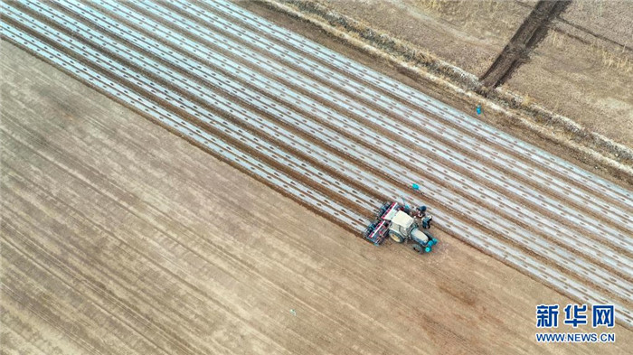 新疆喀什地區(qū)巴楚縣農(nóng)民在使用機(jī)械進(jìn)行春播(3月28日攝,無人機(jī)照片)。新華社記者 馬鍇 攝
