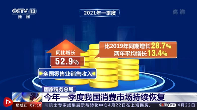 央視網(wǎng)消息:國家稅務(wù)總局?jǐn)?shù)據(jù)顯示,一季度,我國零售業(yè)銷售收入兩年平均增長超10%,消費市場持續(xù)恢復(fù)。