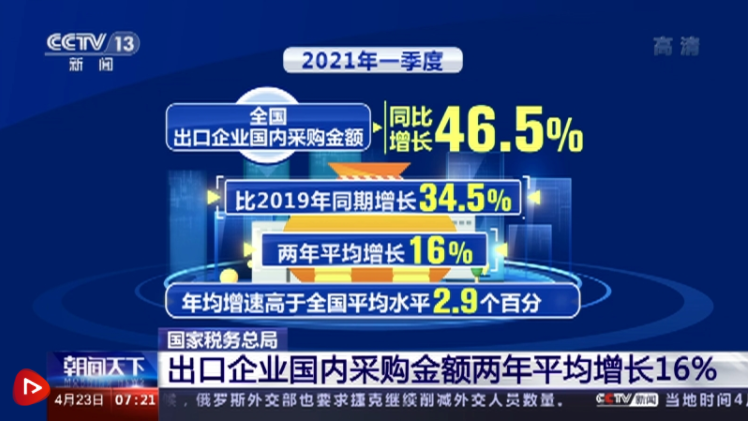 央視網(wǎng)消息:外貿(mào)高質(zhì)量發(fā)展是我國經(jīng)濟(jì)增長的重要拉動(dòng)力。國家稅務(wù)總局相關(guān)負(fù)責(zé)人表示,稅務(wù)部門積極實(shí)施出口退稅便利化措施,一季度全國出口企業(yè)國內(nèi)采購金額兩年平均增長16%。