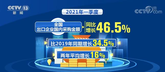 2021年一季度,海外需求復(fù)蘇繼續(xù)拉動(dòng)我國出口快速增長,全國出口企業(yè)國內(nèi)采購金額同比增長46.5%,比2019年同期增長34.5%,兩年平均增長16%,年均增速高于全國平均水平2.9個(gè)百分點(diǎn)。