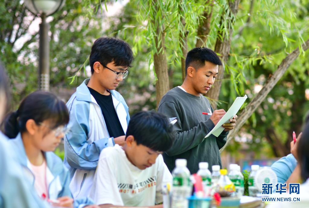 記者在這個特殊的“帳篷課堂”看到,學(xué)生們有的正在集中做著卷子,有的在復(fù)習(xí)課文,老師在一旁耐心講解。遠處,空置的教學(xué)樓懸掛著條幅,上面寫著“用拼搏的汗水灌注無悔的高三路 考前不怕 考后不悔”。