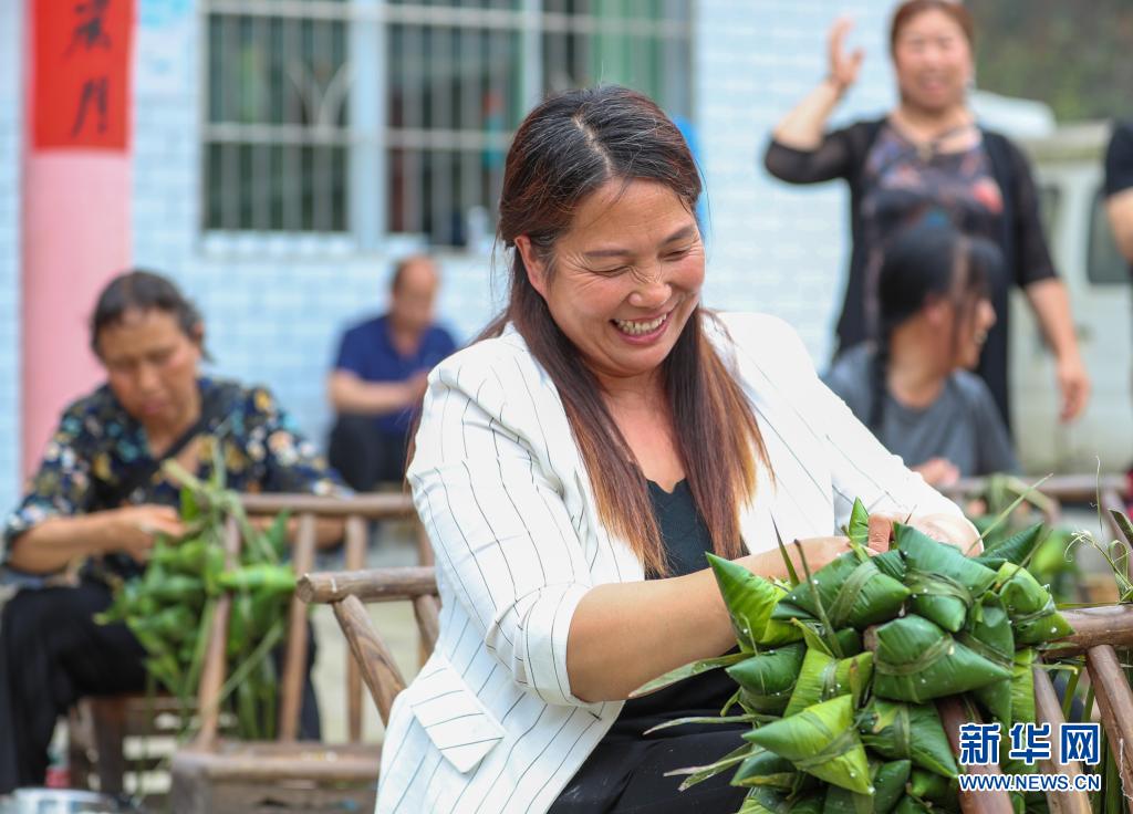 6月2日,貴州省銅仁市玉屏侗族自治縣亞魚鄉(xiāng)郭家灣村村民展示自己包的粽子。新華社發(fā)(胡攀學(xué)攝)
