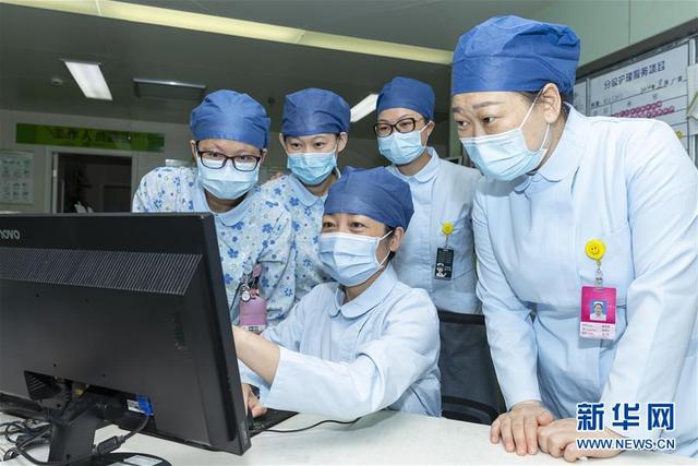 海軍軍醫(yī)大學(xué)第二附屬醫(yī)院急診、重癥醫(yī)學(xué)科護(hù)士長陳靜(中)與腎內(nèi)科護(hù)士交流病人情況(8月5日攝)。新華社發(fā)(汪輝 攝)