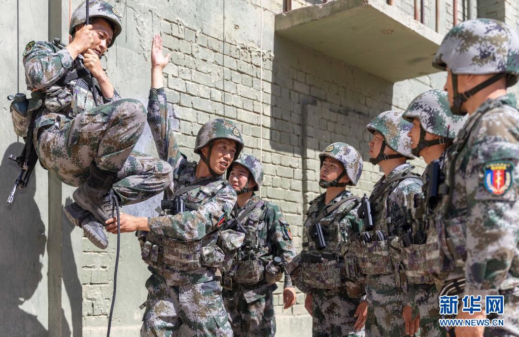 陸軍第76集團(tuán)軍某特戰(zhàn)旅特戰(zhàn)營營長劉近(左二)為戰(zhàn)士講解攀登動作要領(lǐng)(7月7日攝)。新華社發(fā)(陳浩 攝)