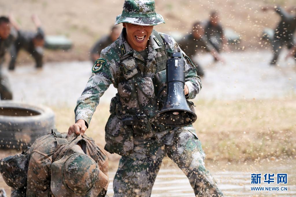 陸軍第76集團(tuán)軍某特戰(zhàn)旅特戰(zhàn)營營長劉近組織特戰(zhàn)隊(duì)員進(jìn)行泥潭摔擒訓(xùn)練(7月14日攝)。新華社記者張永進(jìn)攝