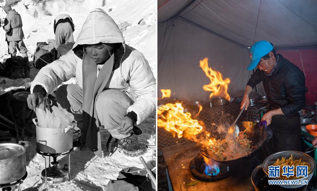 拼版照片:左圖是20世紀(jì)60年代,我國(guó)登山隊(duì)員在海拔5700米冰川上宿營(yíng)時(shí)融冰煮飯(新華社記者陳宗烈攝);右圖是2020年5月10日,廚師在海拔6500米的前進(jìn)營(yíng)地炒菜(新華社記者孫非攝)。新華社發(fā)