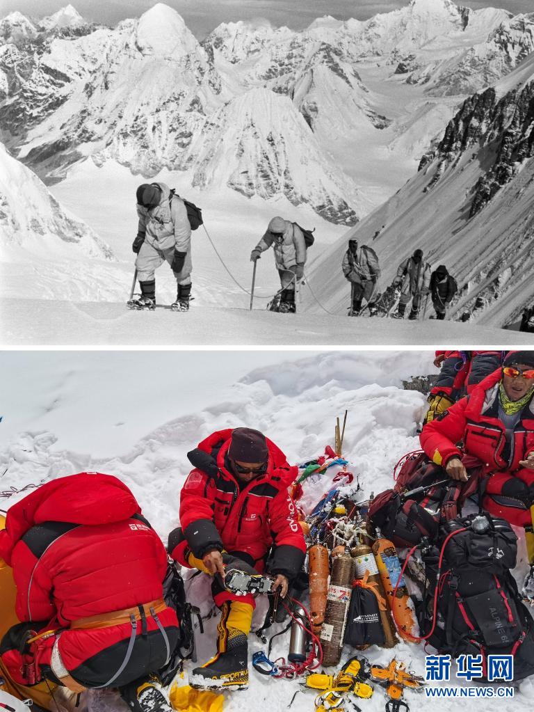拼版照片:上圖是1960年,登山隊(duì)隊(duì)員在海拔7000米以上的雪坡上前進(jìn)(資料照片);下圖是2020年5月21日拍攝的2020珠峰高程測(cè)量登山隊(duì)員所使用的現(xiàn)代登山設(shè)備(新華社特約記者拉巴攝)。新華社發(fā)