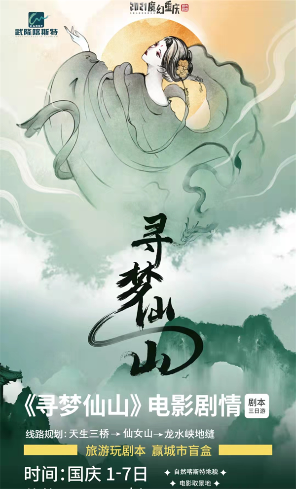 作為國內(nèi)熱門的影視取景地,武隆憑借獨特的自然風光,吸引了包括《滿城盡帶黃金甲》、《變形金剛4》、《爸爸去哪兒2》、《三生三世十里桃花》、《我們十七歲》等眾多影視及綜藝節(jié)目到此拍攝取景,現(xiàn)已成為重慶旅游的文化名片。鬼斧神工的自然景觀,加上濃郁的影視文化氛圍,讓《尋夢仙山》沉浸式劇本殺更新奇和神秘。國慶出發(fā)去武隆玩“劇本殺”,讓我們拭目以待吧!