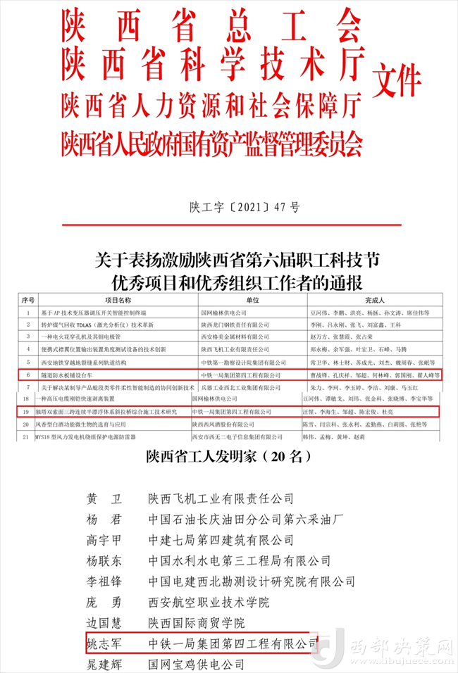 西部決策網(wǎng)訊近日,在陜西省總工會、科技廳、人社廳、國資委聯(lián)合開展的陜西省第六屆職工科技節(jié)活動中,中鐵一局四公司機械修造廠憑借成果《隧道防水板鋪設(shè)臺車》榮獲陜西省職工優(yōu)秀創(chuàng)新成果二等獎,中鐵一局四公司工程技術(shù)管理部憑借成果《獨塔雙索面三跨連續(xù)半漂浮體系斜拉橋綜合施工技術(shù)研究》榮獲陜西省職工優(yōu)秀創(chuàng)新成果三等獎,理小路項目姚志軍被授予“陜西省工人發(fā)明家”稱號。