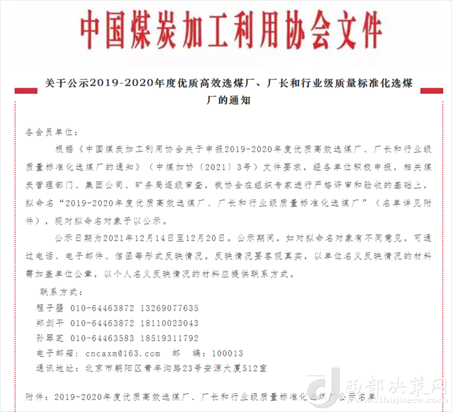 西部決策網(wǎng)訊12月14日,從中國煤炭加工利用協(xié)會(huì)傳來喜訊,陜煤集團(tuán)陜北礦業(yè)檸條塔公司選煤廠榮獲2019-2020年度行業(yè)級(jí)質(zhì)量標(biāo)準(zhǔn)化選煤廠。