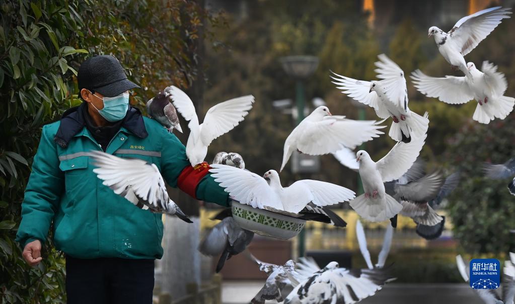 12月28日,在西安市新城廣場(chǎng),工作人員給廣場(chǎng)鴿喂食。新華社記者 陶明 攝