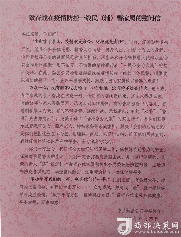 西部決策網(wǎng)訊為表達(dá)對(duì)奮戰(zhàn)在疫情防控一線民輔警家屬的崇高敬意,感謝他們對(duì)公安工作的理解和支持,12月29日下午,勉縣公安局組織開(kāi)展疫情防控一線民輔警家屬慰問(wèn)活動(dòng),為家屬們送去慰問(wèn)信和慰問(wèn)品,并通過(guò)他們向奮戰(zhàn)在一線的民輔警傳遞勉縣公安局黨委的溫暖和關(guān)愛(ài),以更加飽滿(mǎn)的熱情、昂揚(yáng)的斗志投入到疫情防控工作中。
