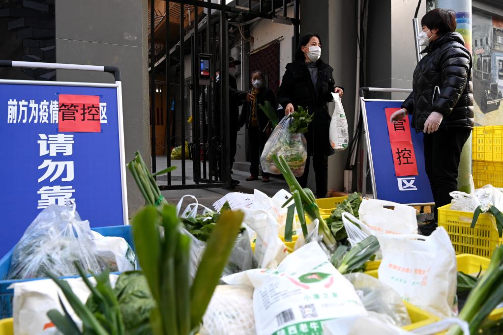 12月29日,在西安市新城區(qū)西一路街道通濟(jì)南坊一號院,居民在領(lǐng)取免費生活物資。新華社記者 劉瀟 攝