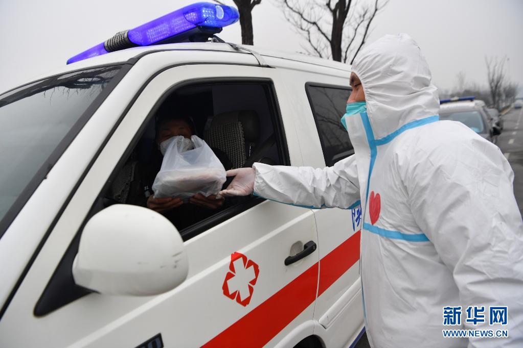 1月4日,在西安市雁塔區(qū),志愿者暢璘將食品送至一位負責(zé)運輸核酸檢測樣本的救護車駕駛員手中。新華社記者 張博文 攝