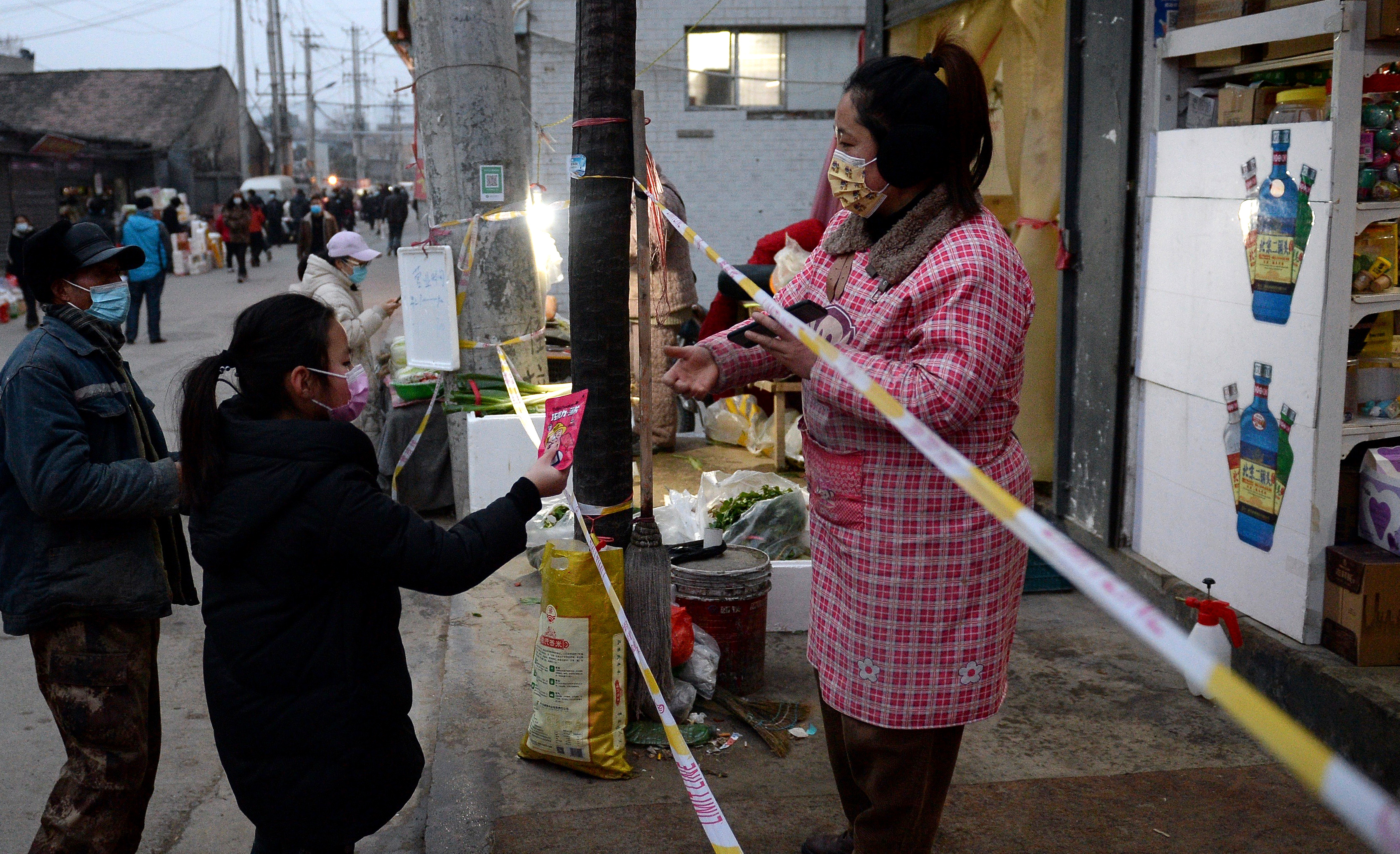 西安市未央?yún)^(qū)未央街道西唐寨村的志愿者在維持村民購物秩序(1月7日攝)。