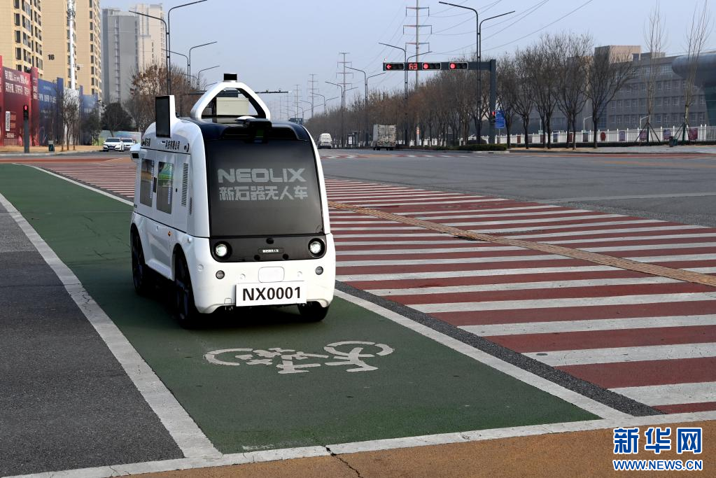 1月9日,無人配送車行駛在西咸新區(qū)灃西新城尚業(yè)路上。新華社記者 陶明 攝