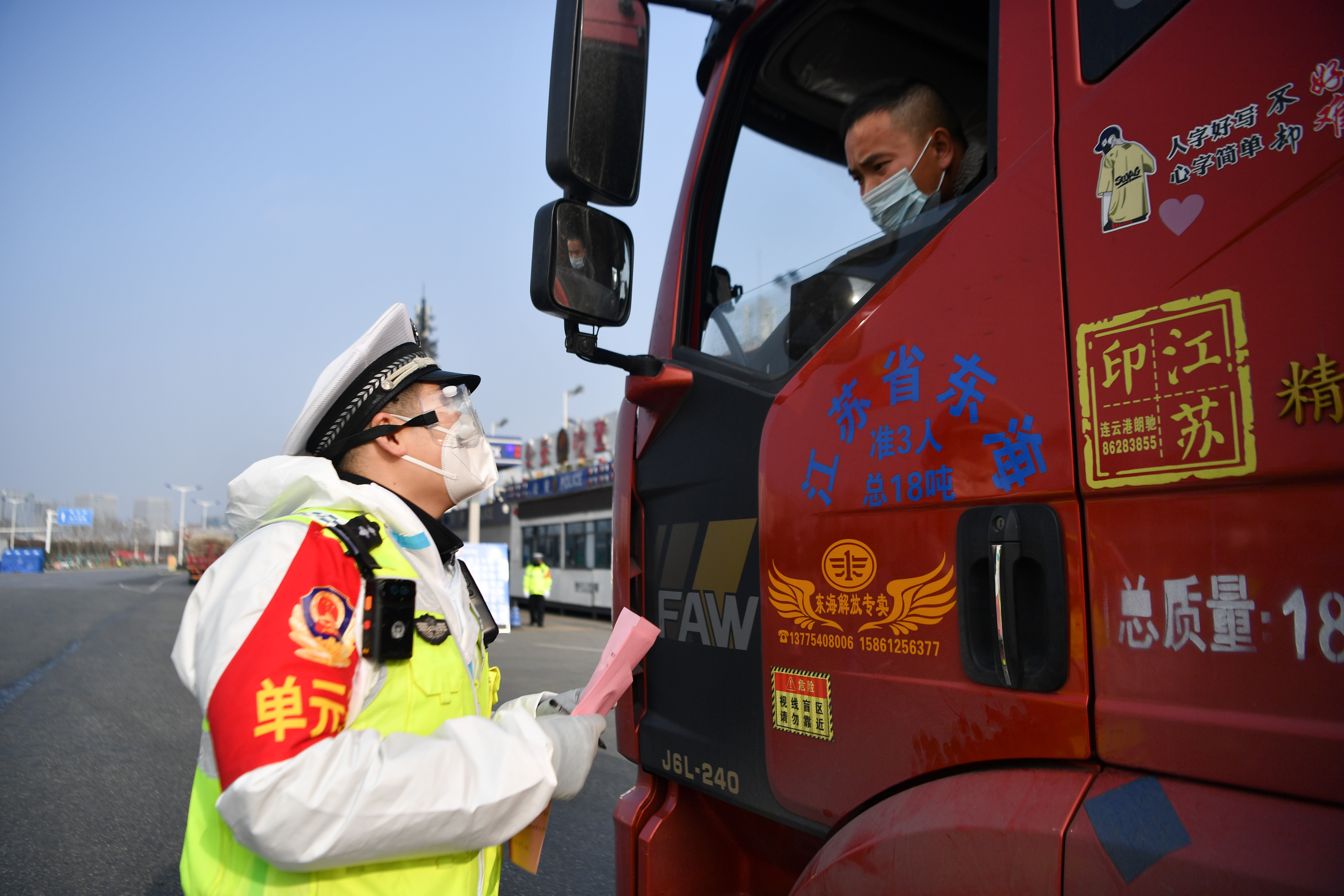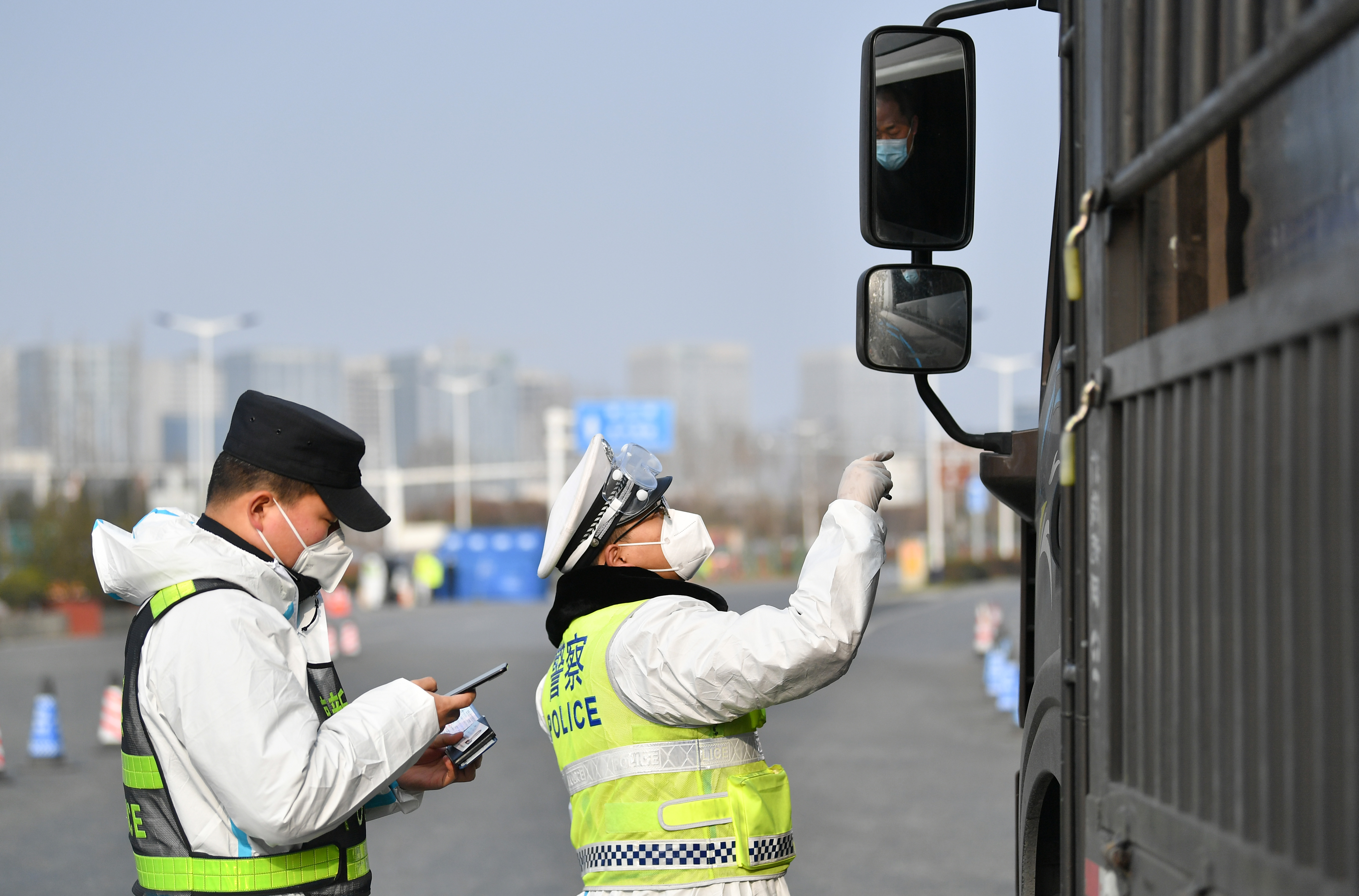 1月10日,西安市公安局浐灞生態(tài)區(qū)分局民警在西安市繞城高速新筑收費(fèi)站查驗(yàn)駕駛員健康碼。新華社記者 張博文 攝