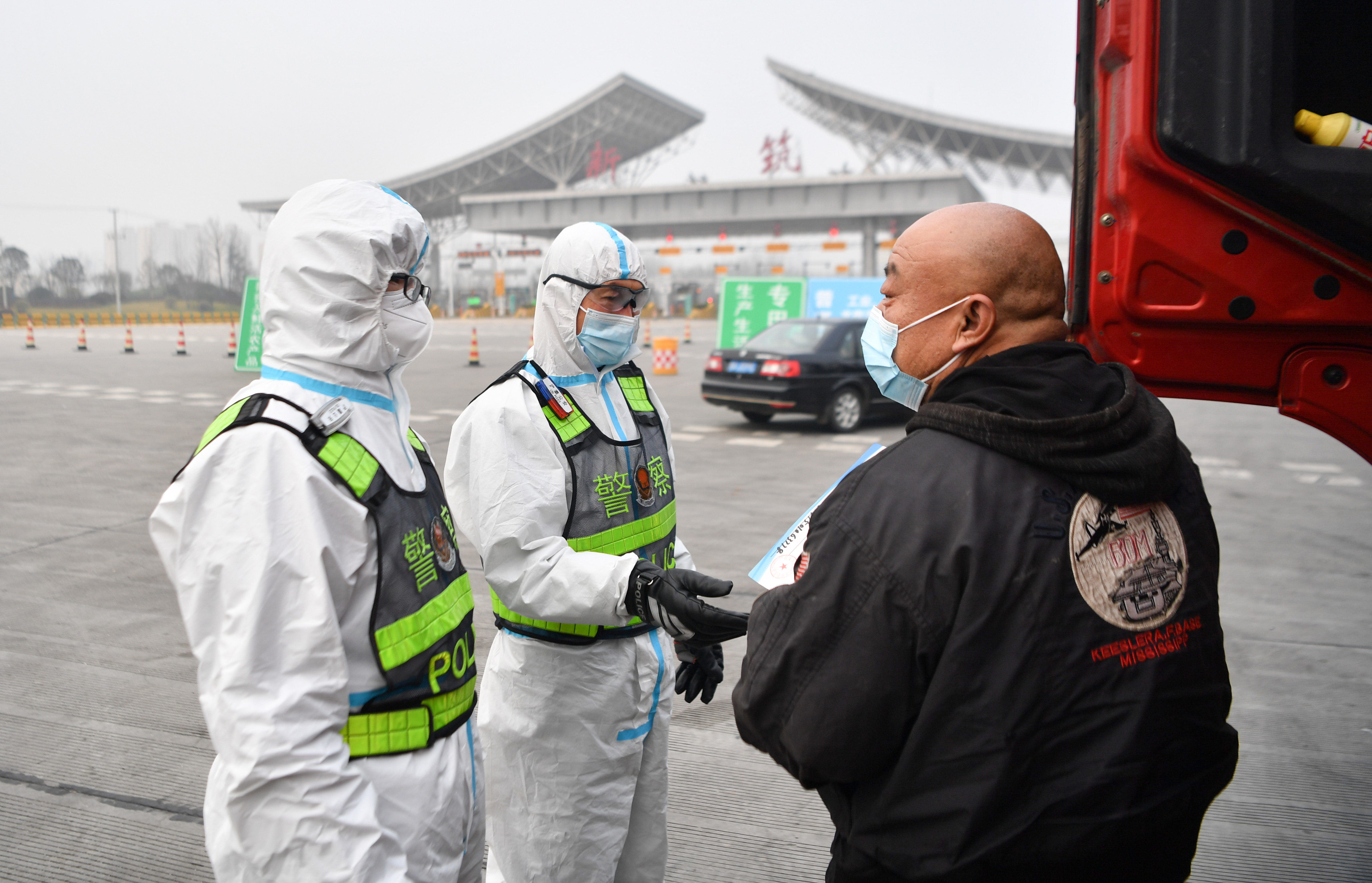 1月10日,西安市公安局高新技術(shù)產(chǎn)業(yè)開發(fā)區(qū)分局民警(中)與西安市公安局交通警察支隊(duì)高新大隊(duì)民警(右)在西安市繞城高速河池寨收費(fèi)站聯(lián)合執(zhí)勤。新華社記者 張博文 攝