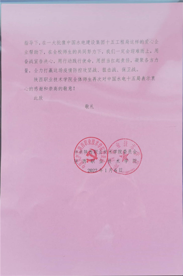 “感謝貴單位在關(guān)鍵時期雪中送炭,于危急關(guān)頭解囊相助……這是對陜西省教育系統(tǒng)、特別是陜西職業(yè)技術(shù)學(xué)院疫情防控工作的熱情支援和資助!”