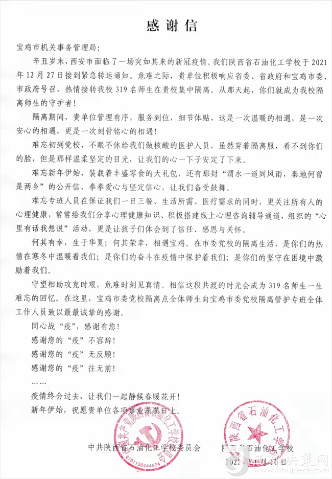 西部決策網(wǎng)訊 (任書彥)12月27日晚9時(shí),寶雞市機(jī)關(guān)事務(wù)管理局接到緊急命令:來自陜西省石油化工學(xué)校319名學(xué)生將于28日早6時(shí)到達(dá)寶雞市委黨校開始集中隔離,寶雞市機(jī)關(guān)事務(wù)管理局負(fù)責(zé)此次隔離學(xué)生的后勤保障工作。這是寶雞市機(jī)關(guān)事務(wù)管理局自全國(guó)十四運(yùn)會(huì)、第八屆特奧會(huì)之后,又迎來的一次“大考”。
