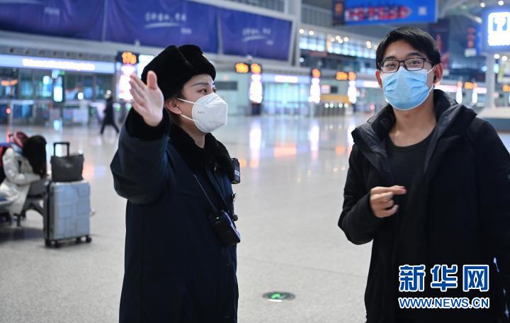 1月16日,西安北站客運員(左)在候車大廳引導(dǎo)旅客乘車。新華社記者 陶明 攝