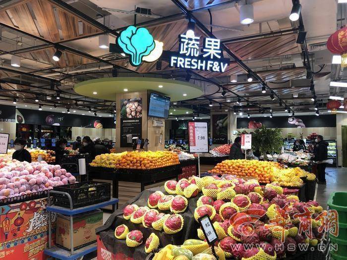 記者體驗(yàn)了一下,超市嚴(yán)格落實(shí)防疫要求,顧客掃碼,憑綠碼進(jìn)入。超市門口,有燈籠、“福”字等年貨。超市播著過年喜慶的音樂,貨物齊全,市民們?cè)谟行蛸徫?,工作人員正在給部分貨物加貨。