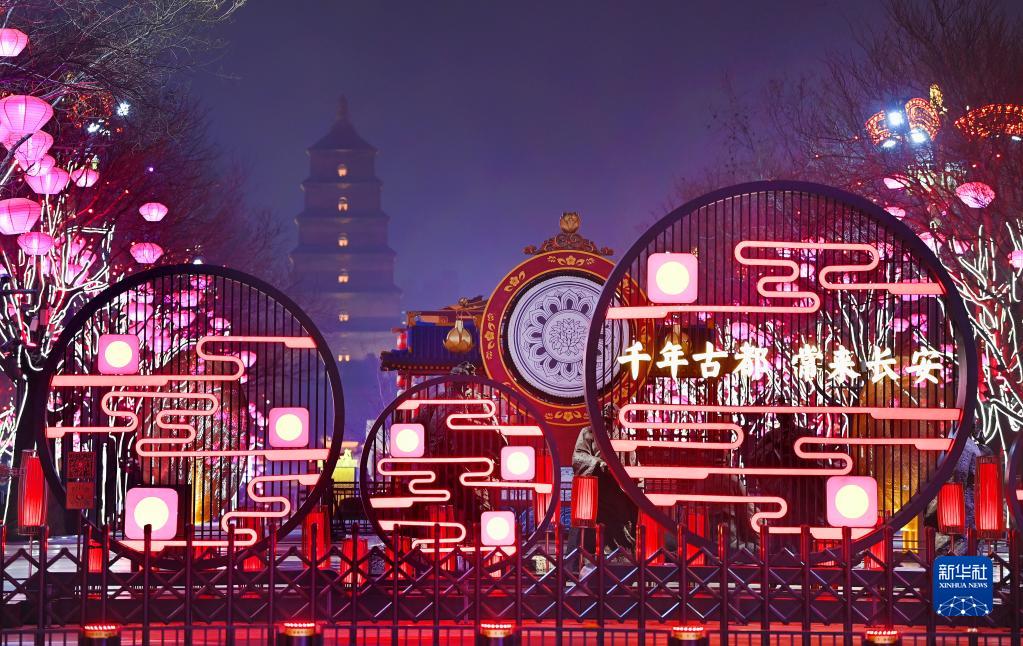 1月21日拍攝的大唐不夜城夜景。春節(jié)臨近,西安市大唐不夜城點(diǎn)亮璀璨奪目的燈光,迎接新春佳節(jié)的到來。新華社記者 陶明 攝