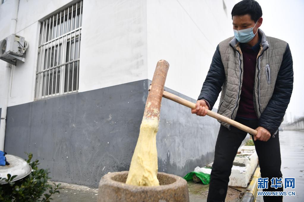 1月27日,西安市鄠邑區(qū)幸福佳苑社區(qū)居民制作糍粑。新華社記者 張博文 攝