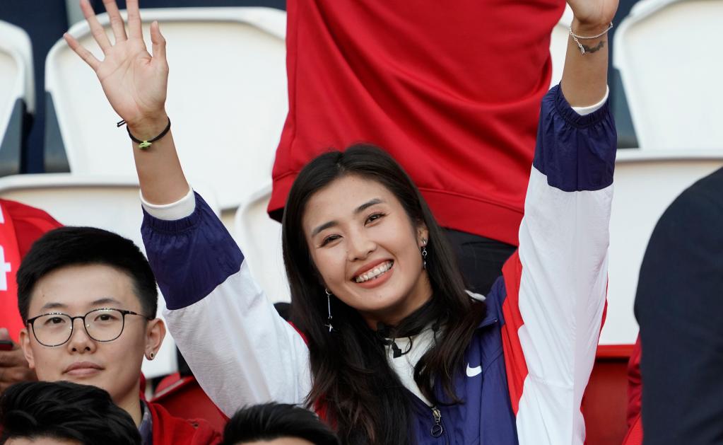 2019年6月13日,中國女足守門員趙麗娜在看臺(tái)上加油助威。新華社記者丁旭攝