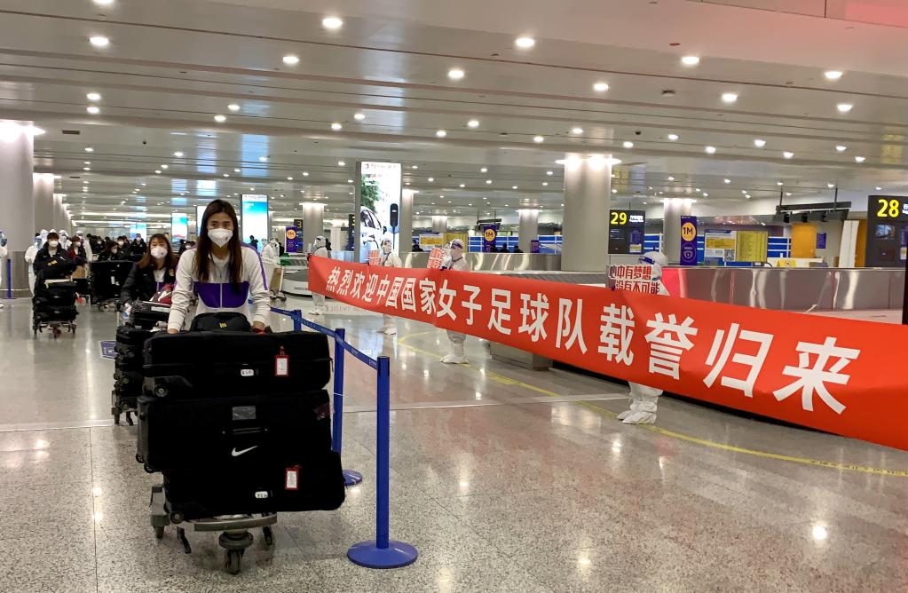 2月7日,中國女足隊(duì)員抵達(dá)上海浦東國際機(jī)場(chǎng)。新華社發(fā)(中國東方航空供圖)