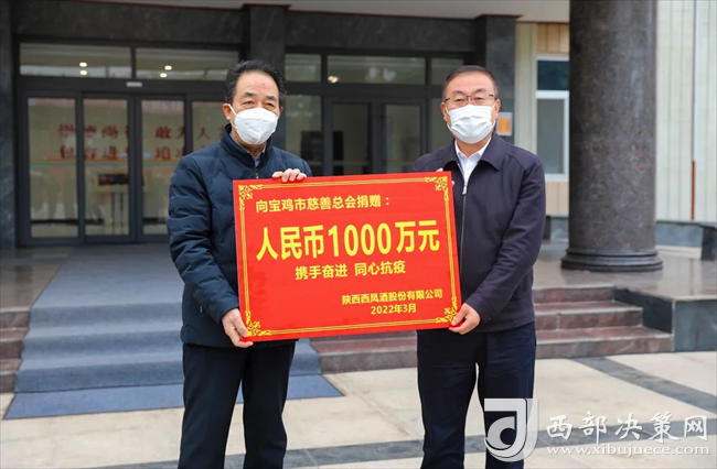 西部決策網訊(韓宗憲 通訊員 羅金)3月18日,陜西西鳳酒股份有限公司向寶雞市慈善總會捐贈1000萬元,支持全市抗疫工作。寶雞市慈善總會常務副會長牟林樂,西鳳集團公司黨委書記、董事長、股份公司董事長張正以及公司班子成員、部分職工代表參加了捐贈儀式。寶雞市慈善總會副會長兼秘書長李海珠主持儀式。
