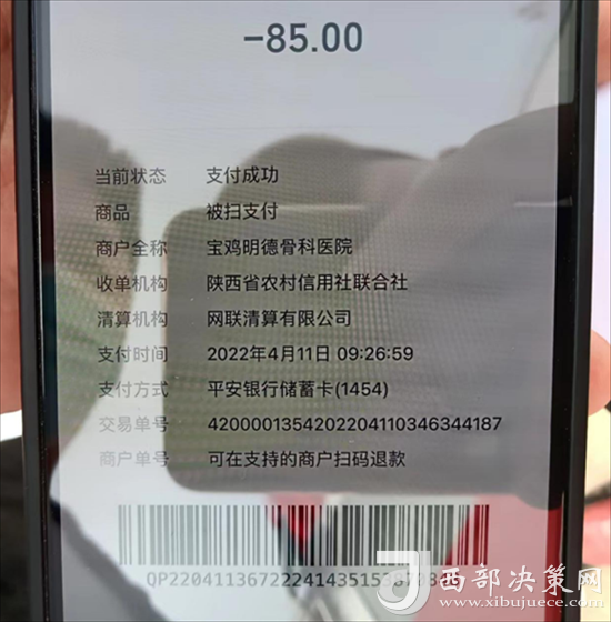 做核酸的市民提供的繳費(fèi)截圖發(fā)現(xiàn),他們兩個人做完核酸繳費(fèi)85元,分別要做咽拭子和鼻拭子兩個項(xiàng)目,收款商戶單位全稱為:寶雞明德骨科醫(yī)院。