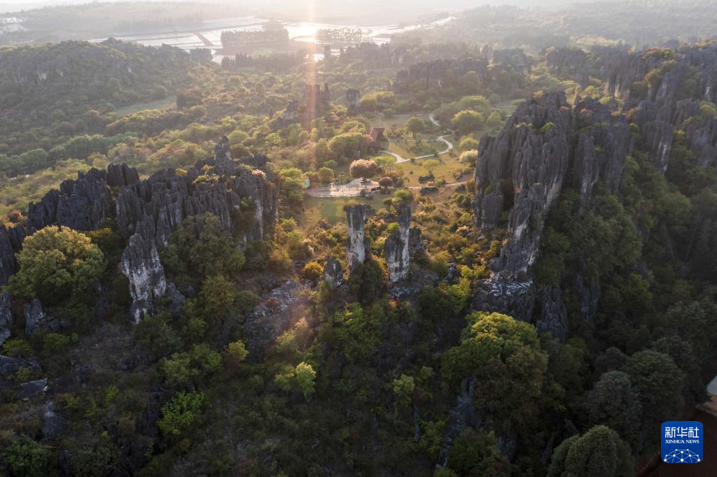 這是4月9日拍攝的石林日落景觀(無(wú)人機(jī)照片)。新華社記者 曹夢(mèng)瑤 攝